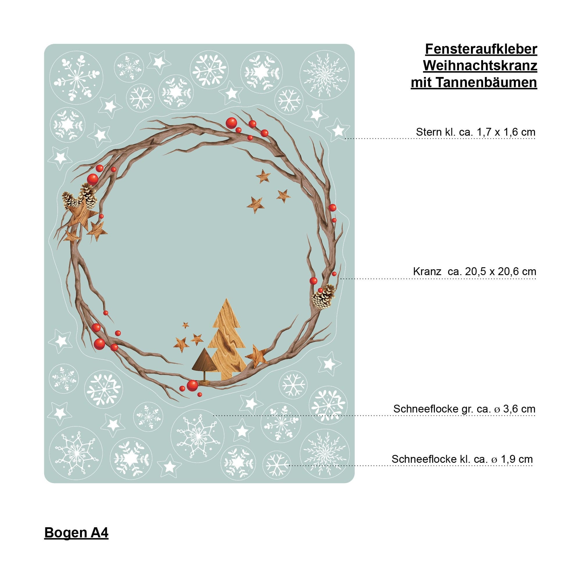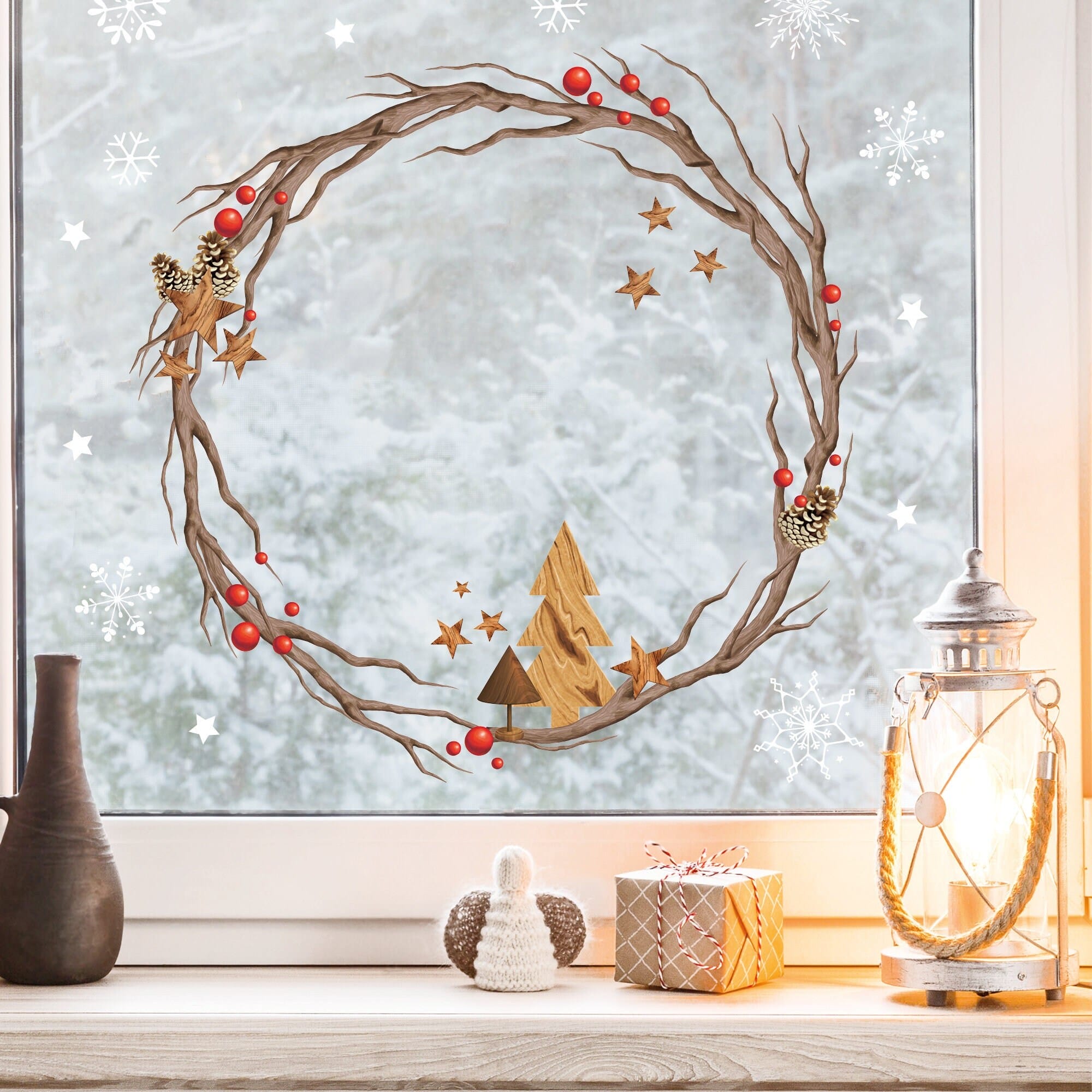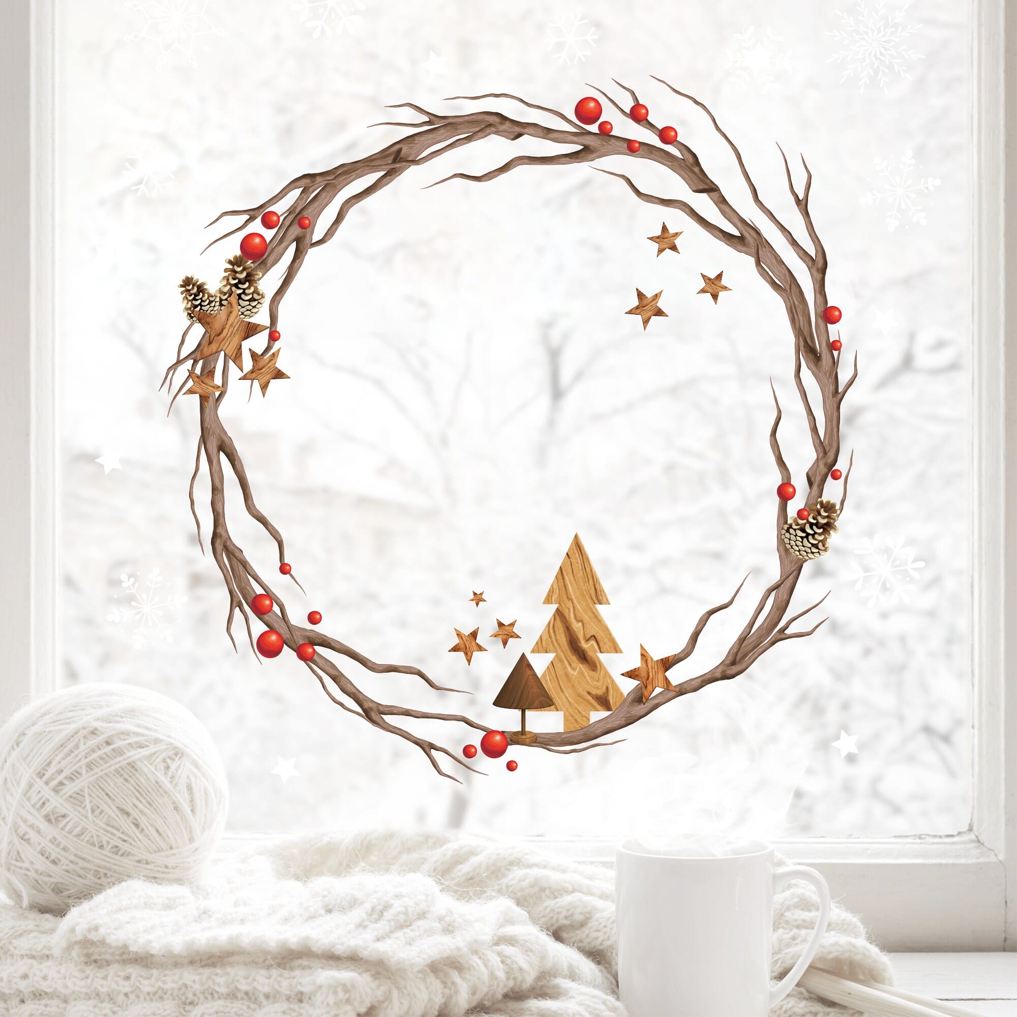 Wiederverwendbares Fensterbild Weihnachten Kranz aus Zweigen Haus Sterne Holzoptik Weihnachtsdeko