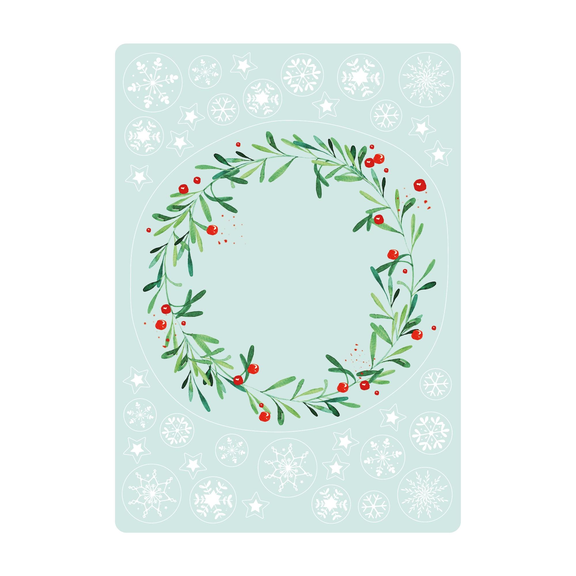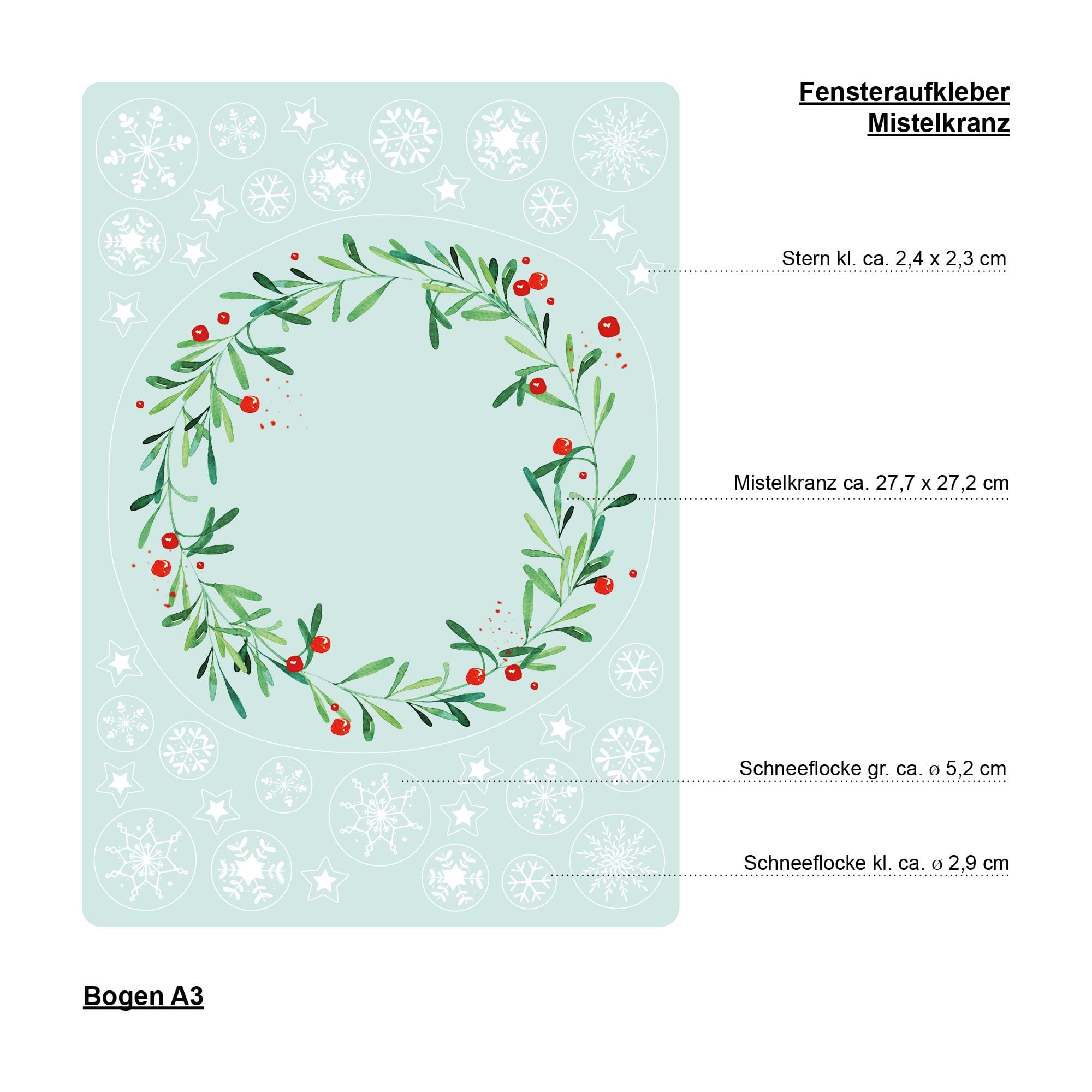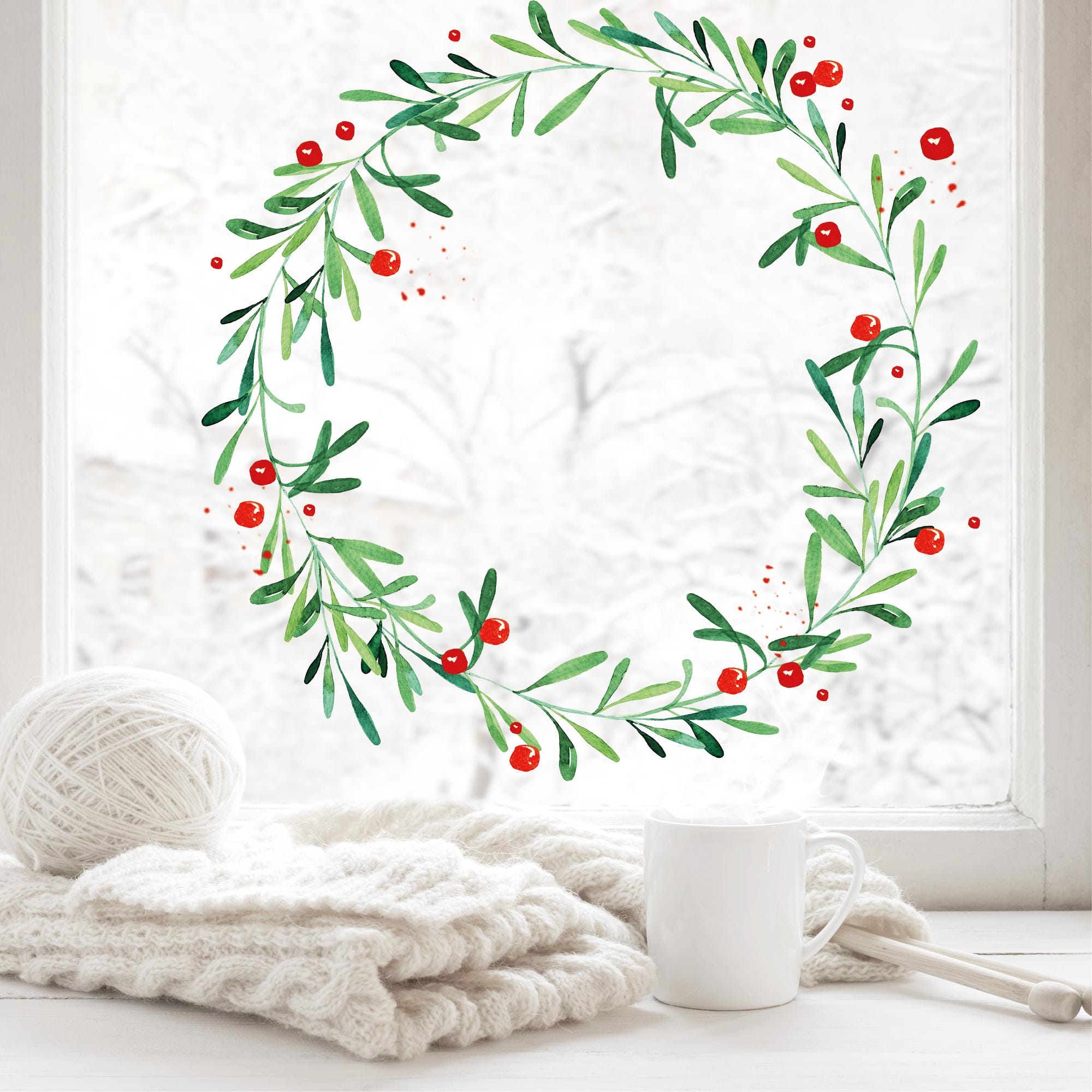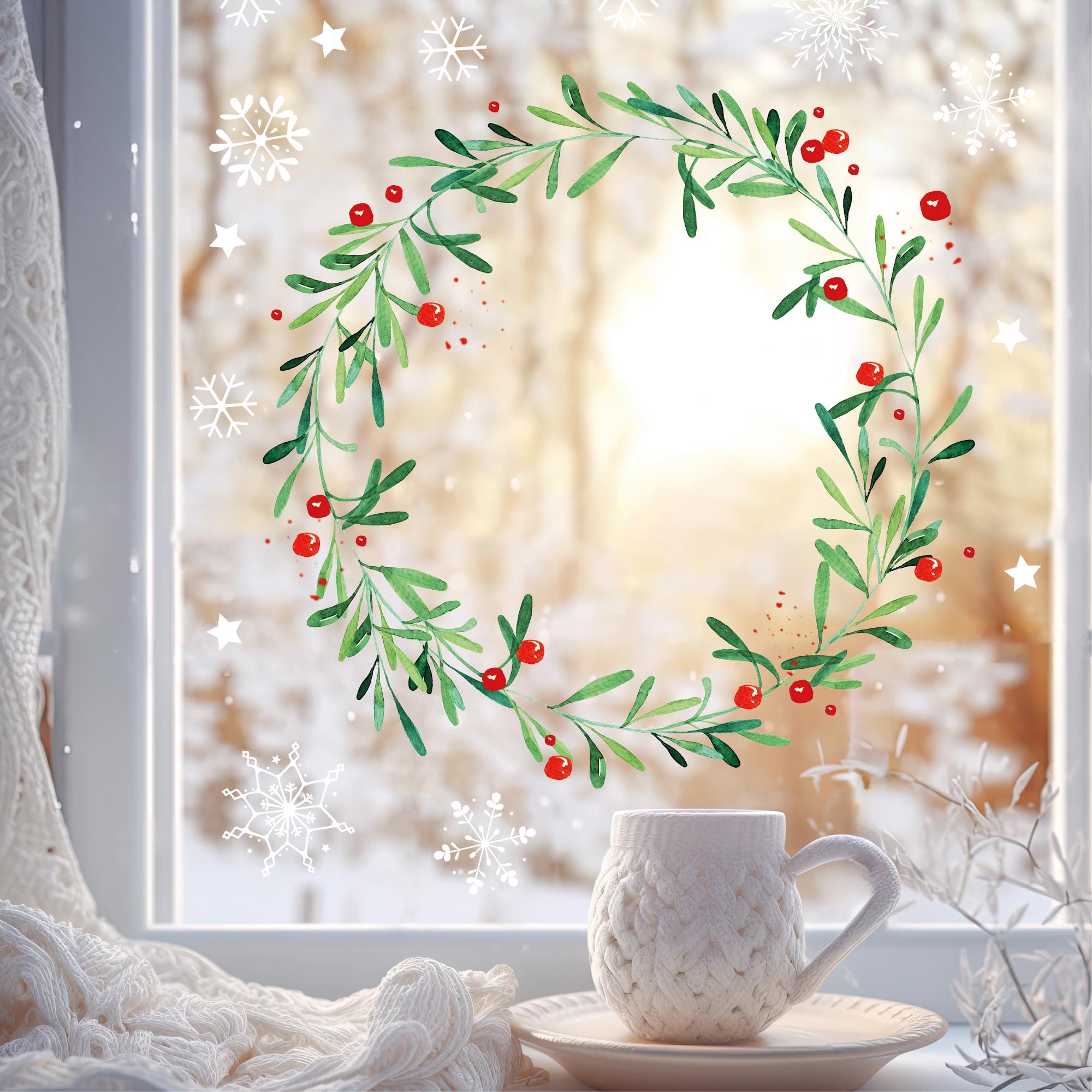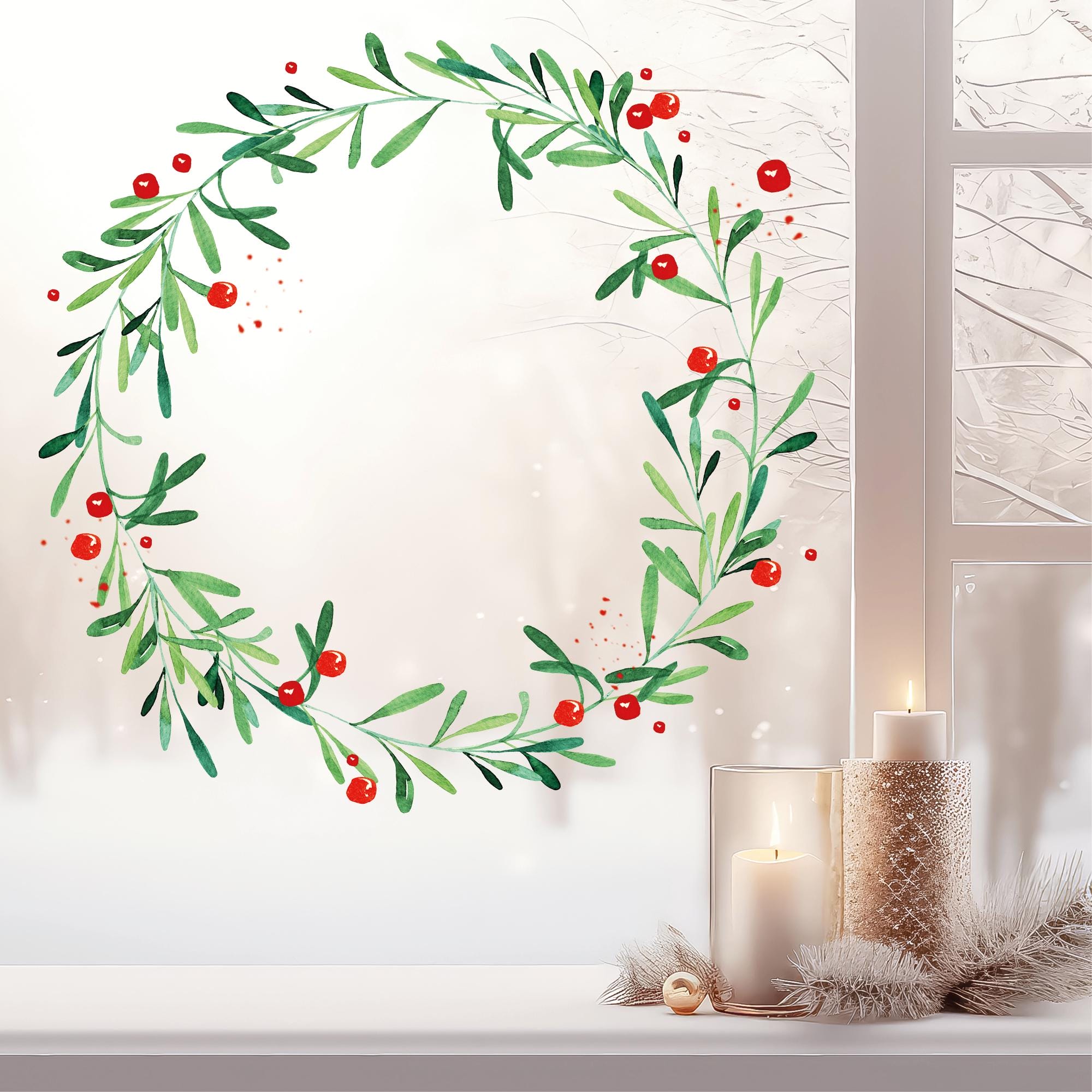 Wiederverwendbar Fensterbild Mistelzweig grün Kranz aus Mistelzweigen rote Früchte Schneeflocken wiederverwendbar Weihnachten Christmas