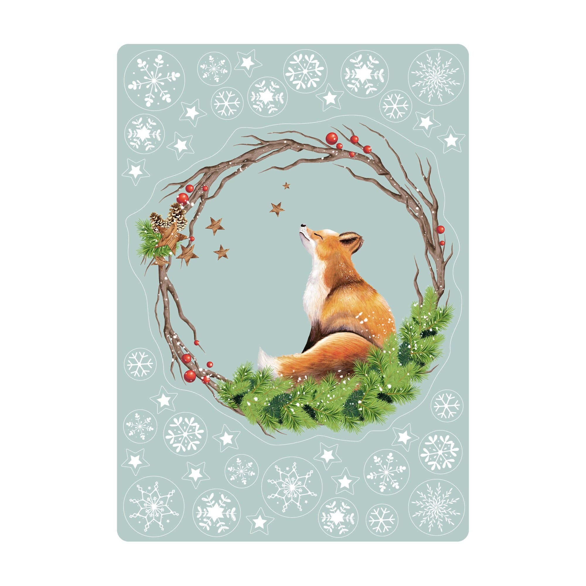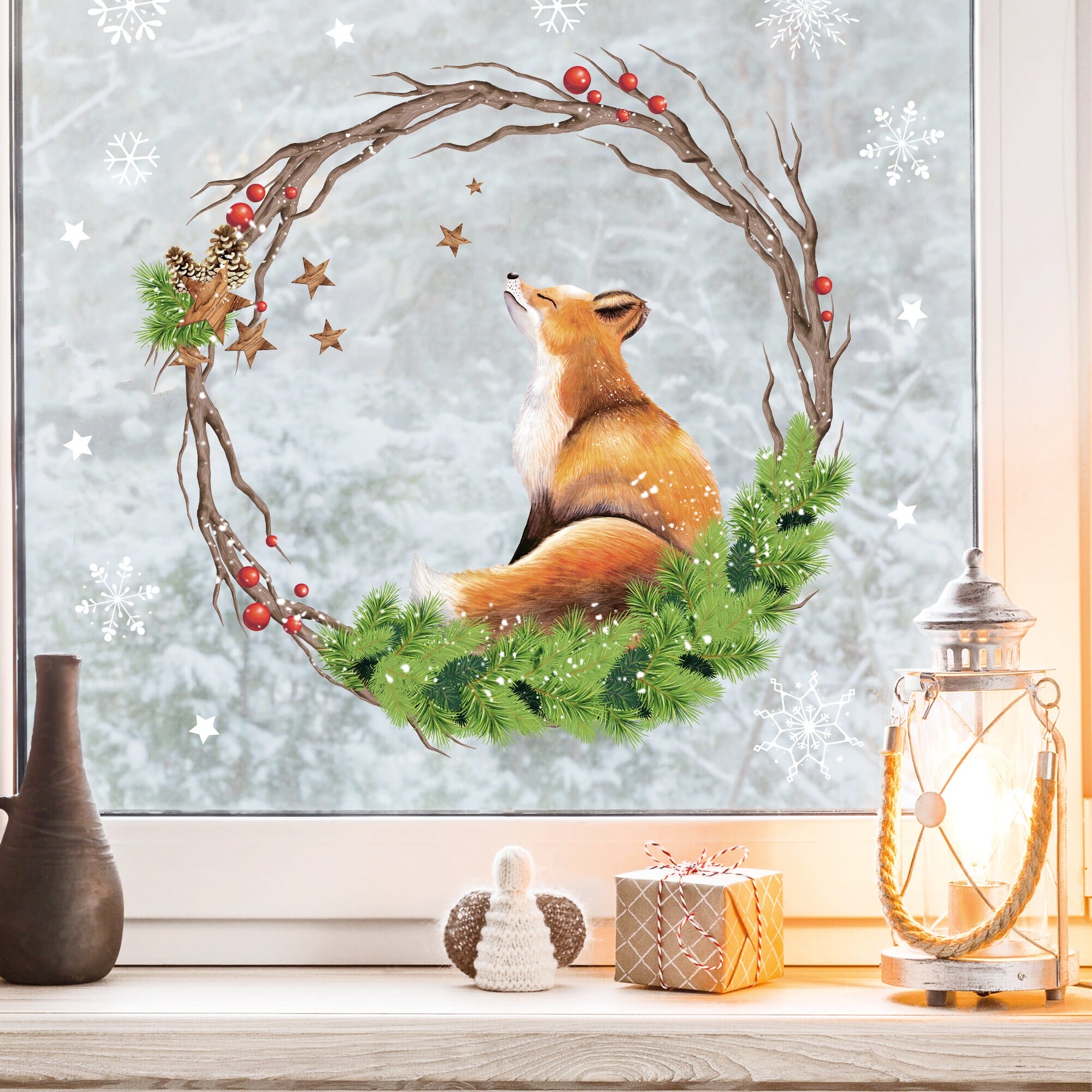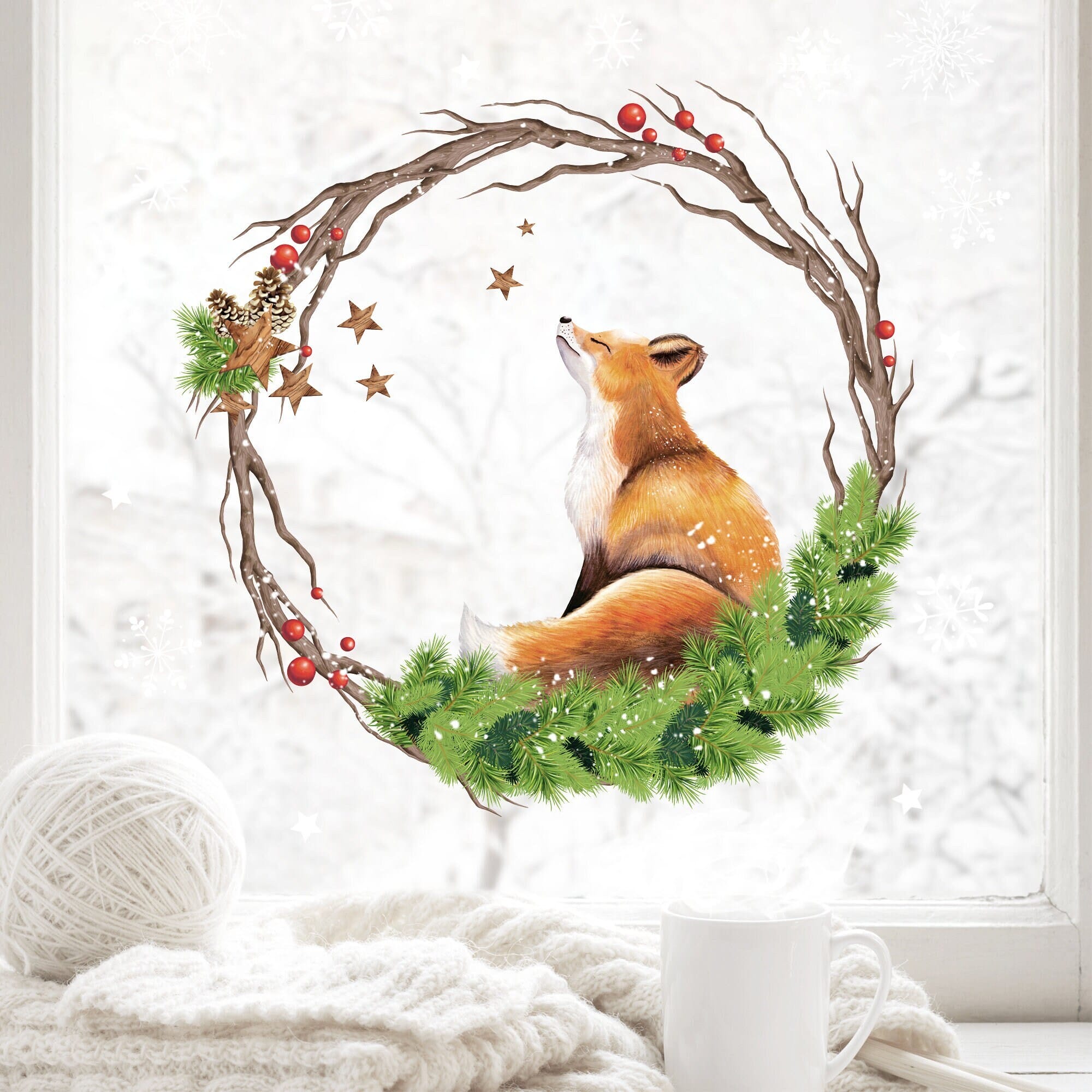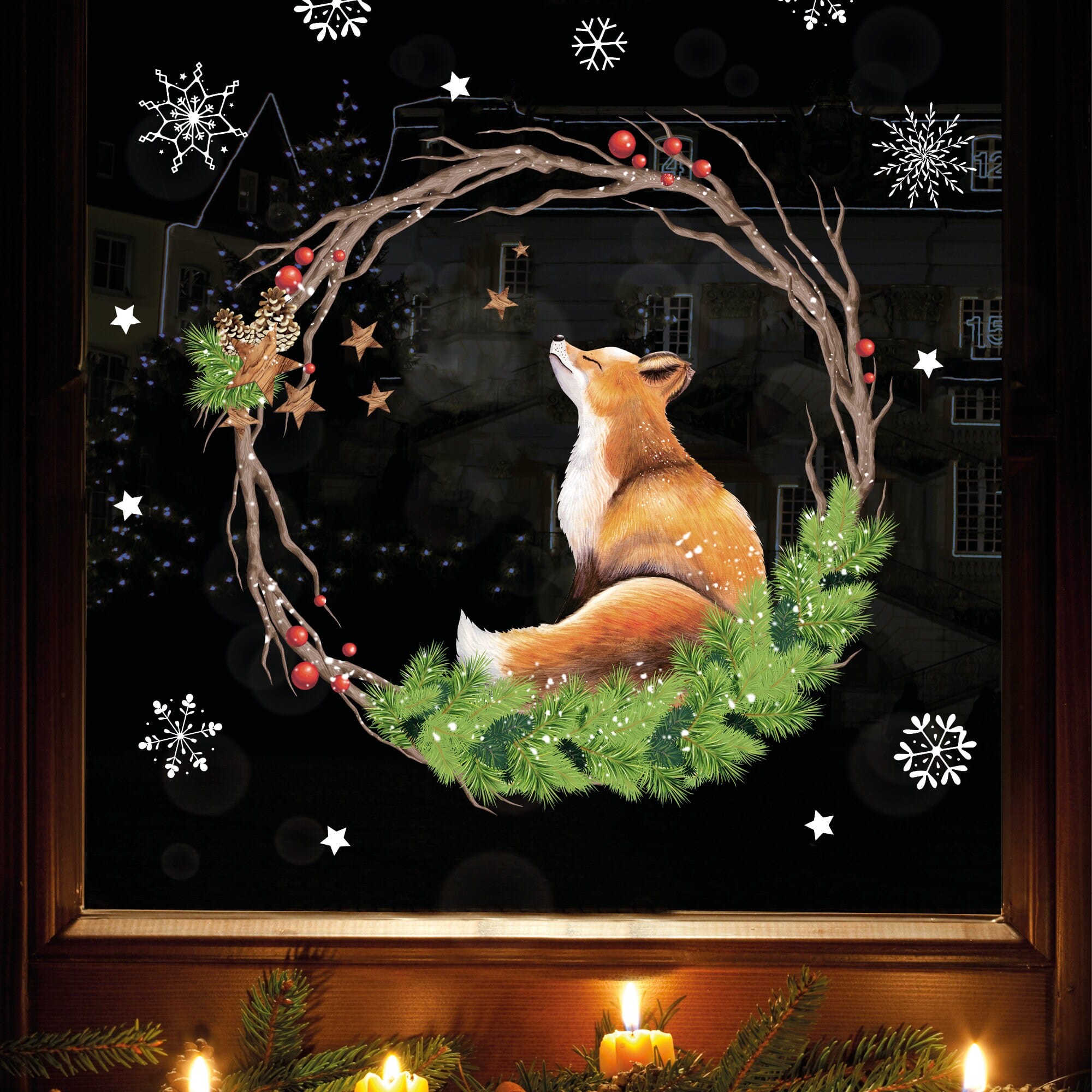 Wiederverwendbar Fensterbild Weihnachten Kranz aus Zweigen Tannengrün Fuchs Sterne Holzoptik Weihnachtsgrün Fensteraufkleber Fensterdeko