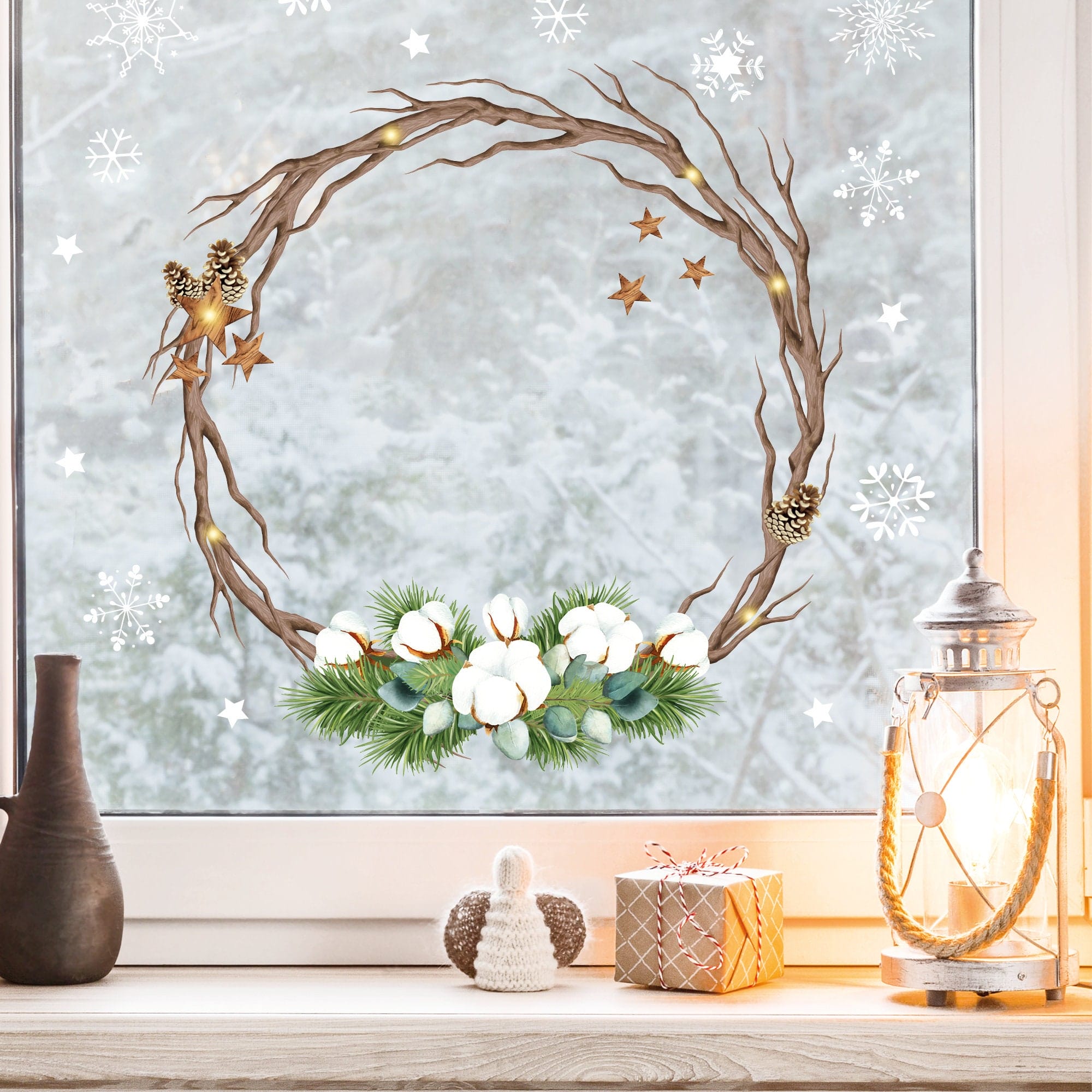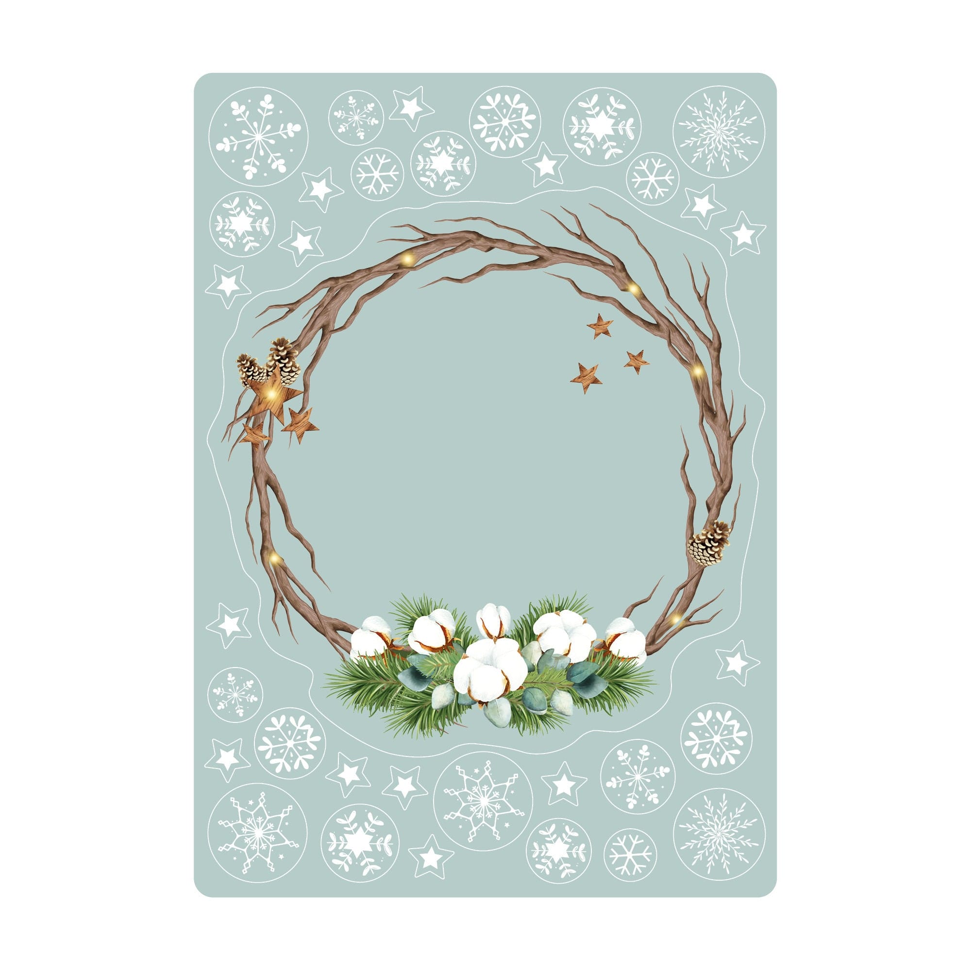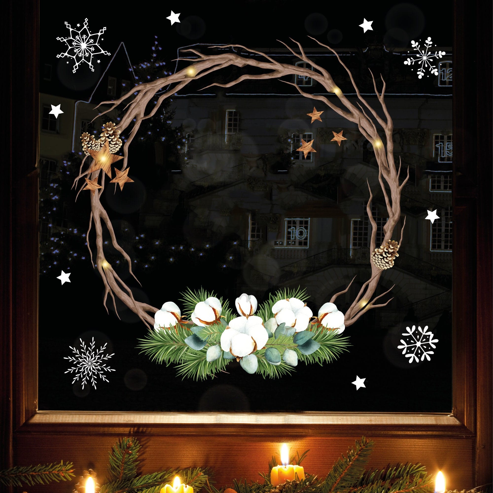 Wiederverwendbares Fensterbild Weihnachten Kranz aus Zweigen mit Tannengrün und Baumwolle Sterne Holzoptik