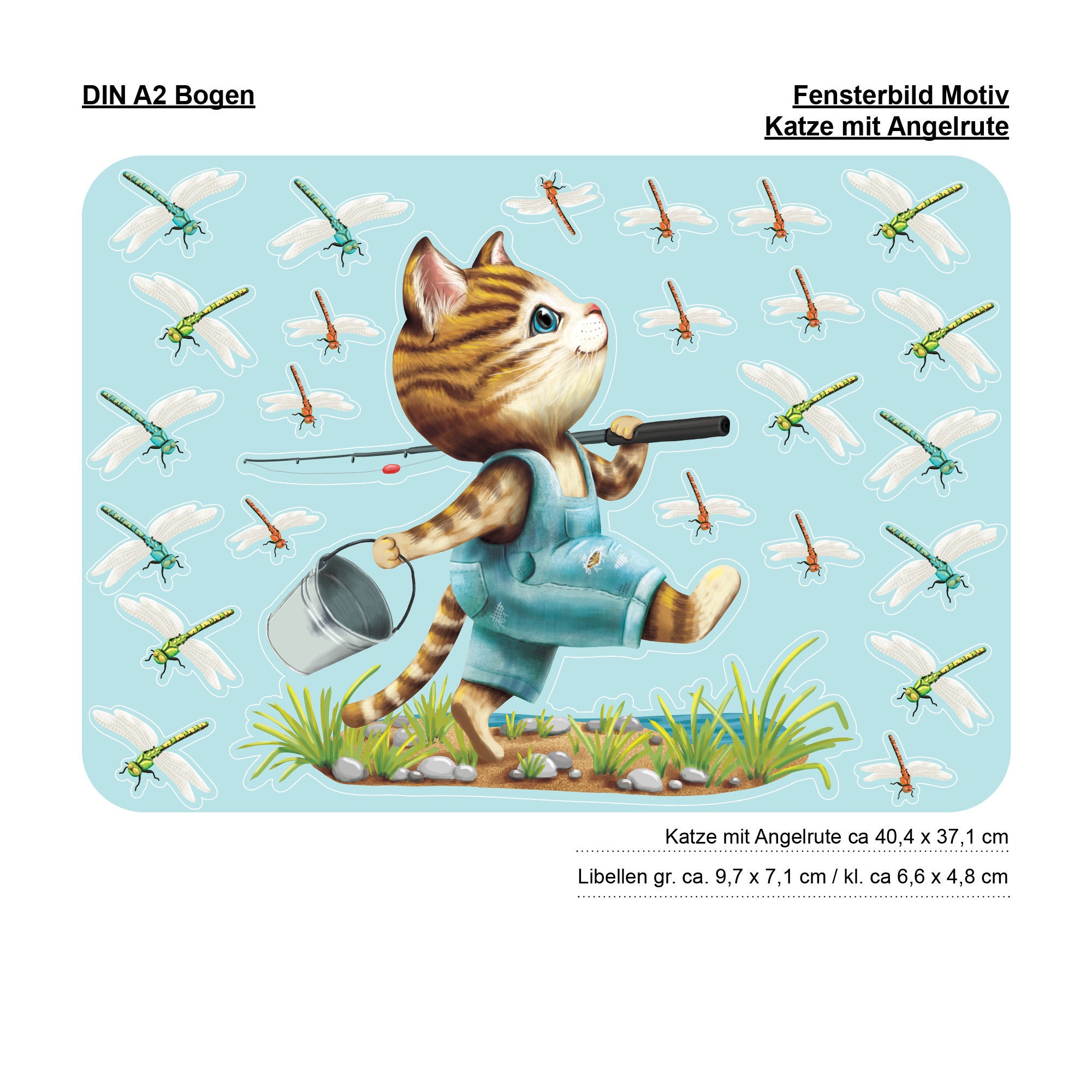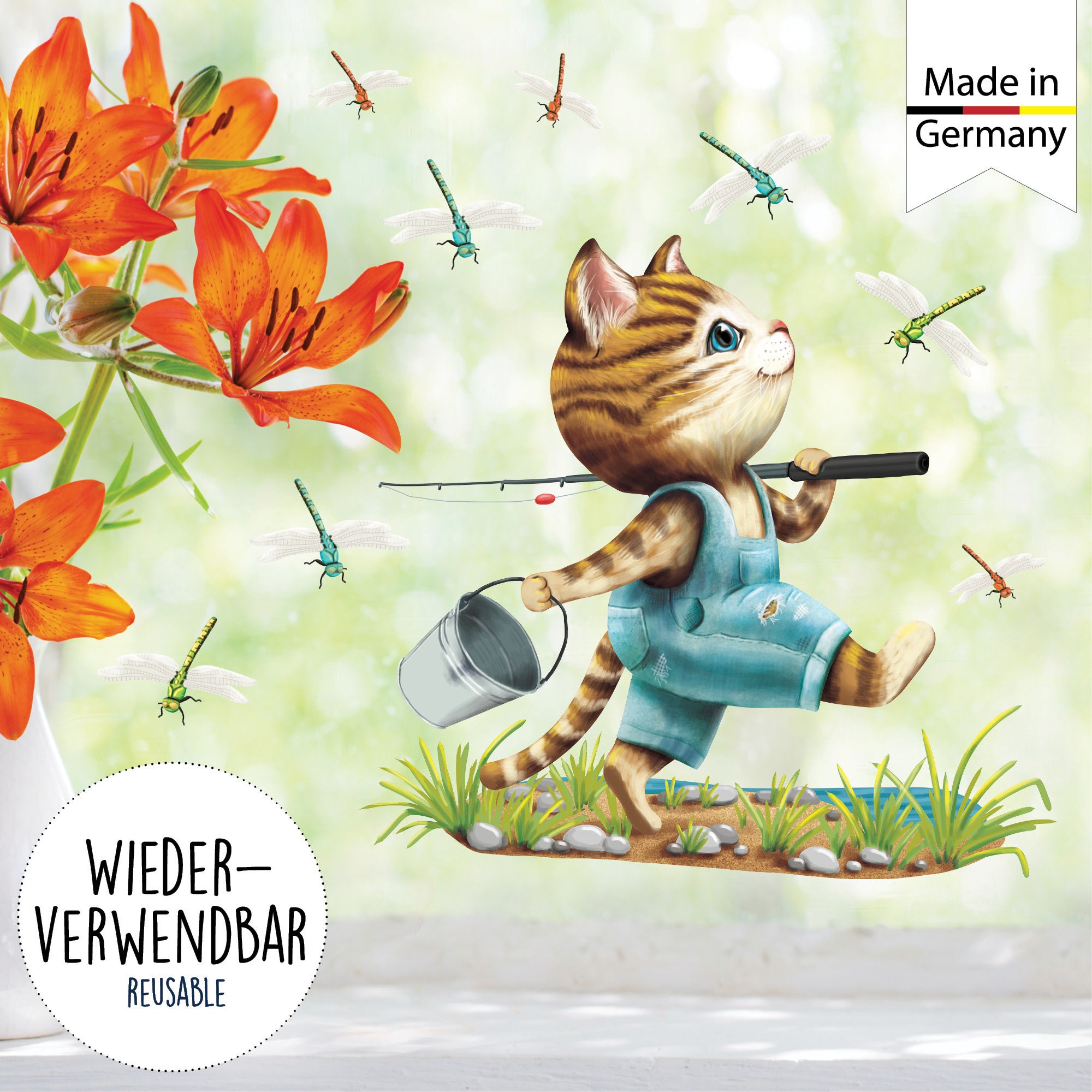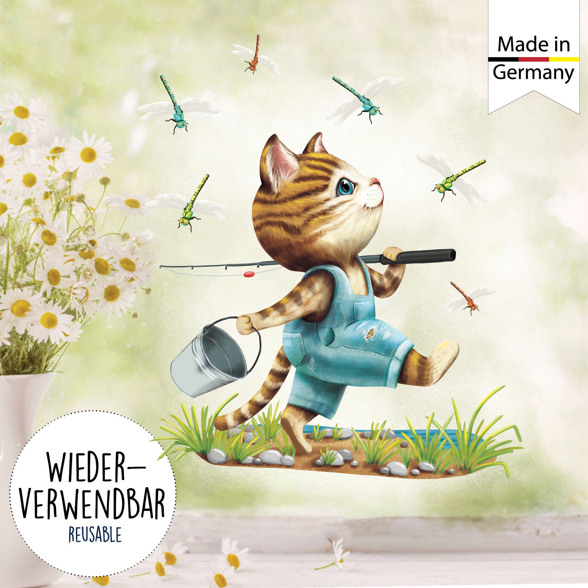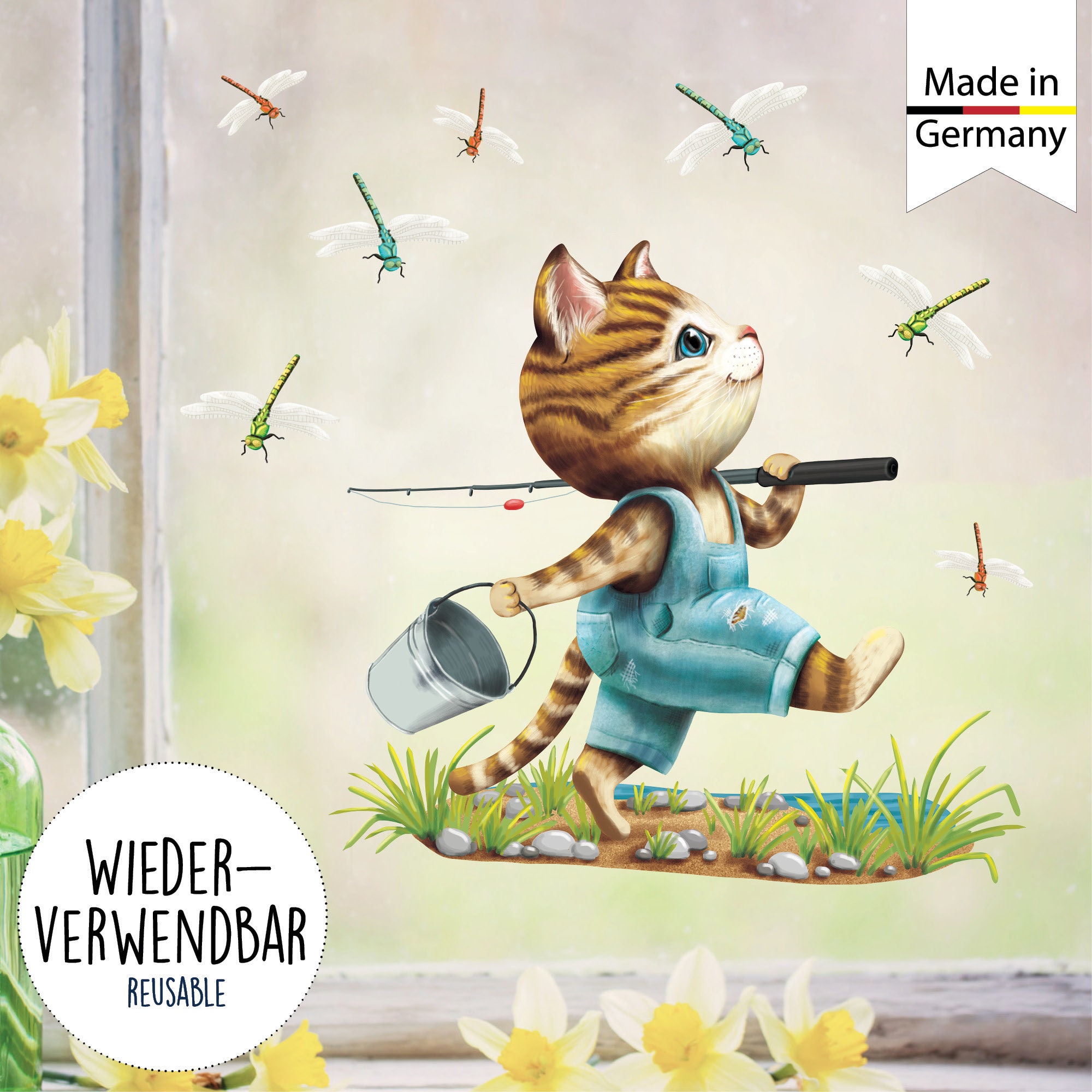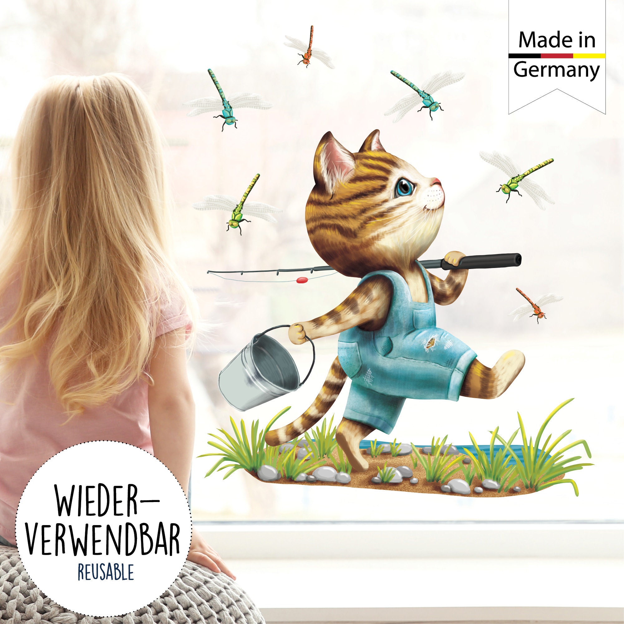 Wiederverwendbares Fensterbild Frühling Kinderzimmer Kind Katze Angler Libellen Fensterdeko angeln, Geschenk