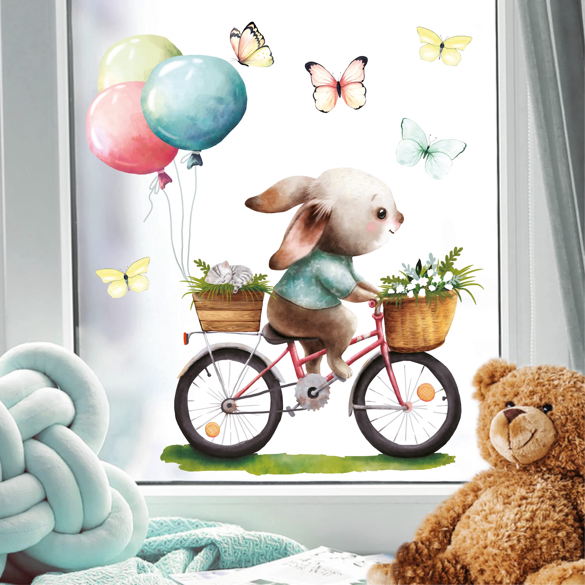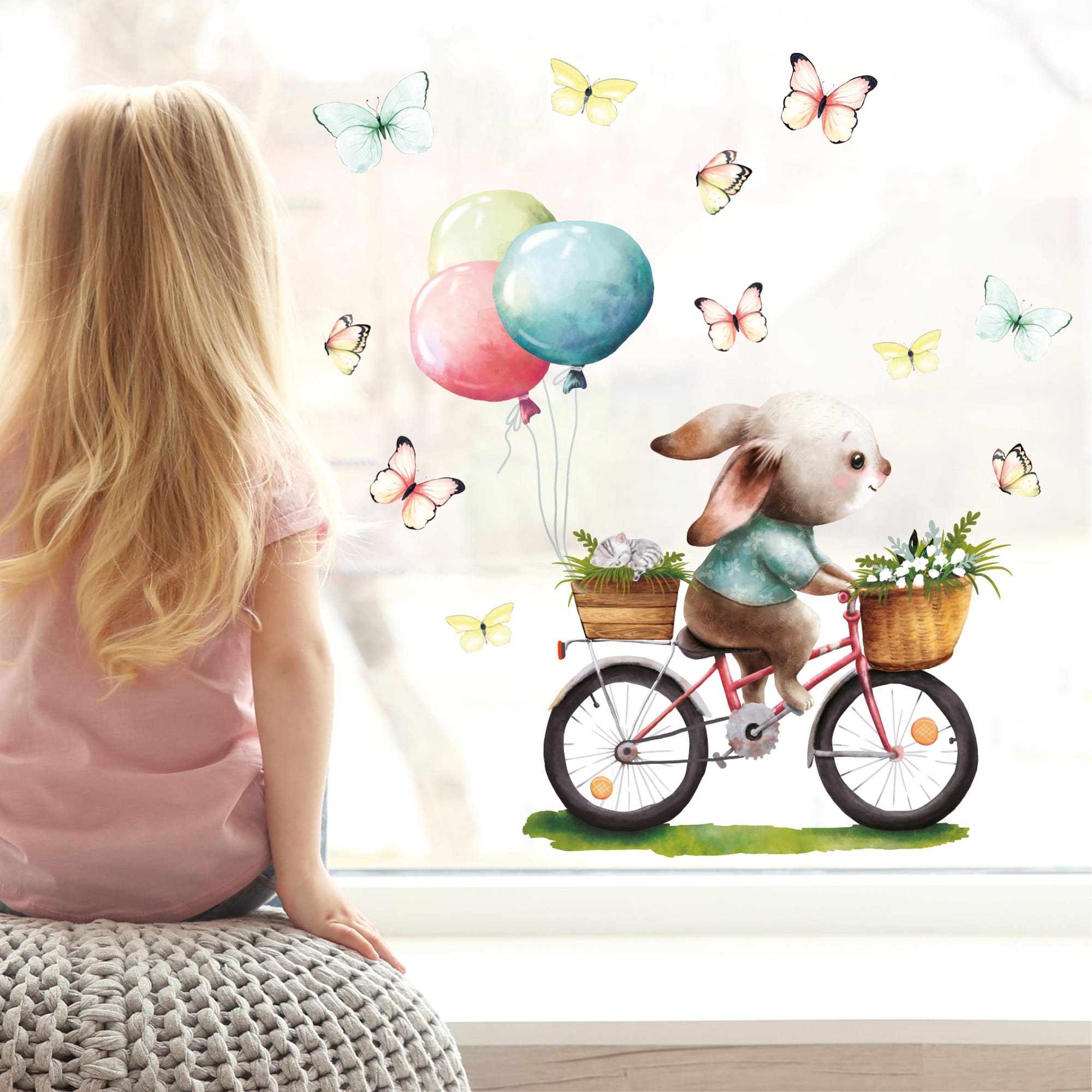 Wiederverwendbarer Fensteraufkleber Frühling Ostern Hase auf einem Fahrrad mit Luftballons und Schmetterlingen, Fensterdeko Kinderzimmer Kind, Frühlingsdeko, Osterdeko