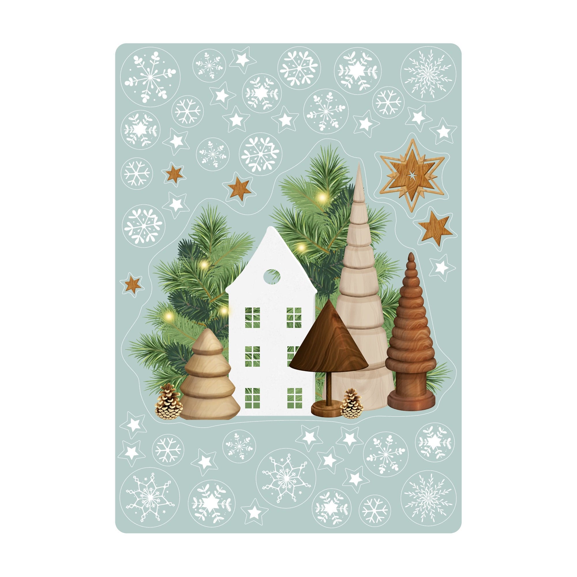 Wiederverwendbares Fensterbild Weihnachten Haus Tannenbäume Holzoptik Sterne Fensterdekoration wiederverwendbar