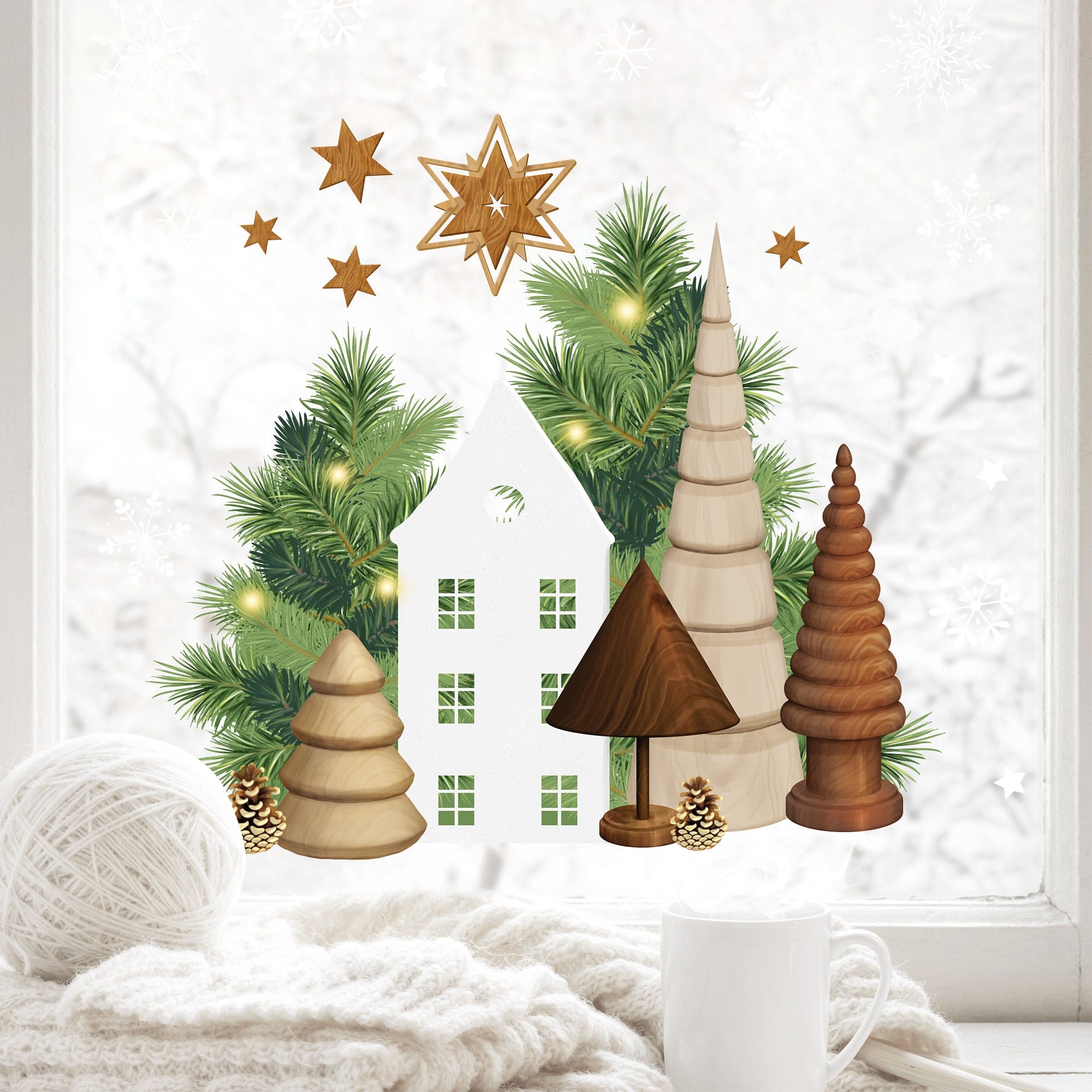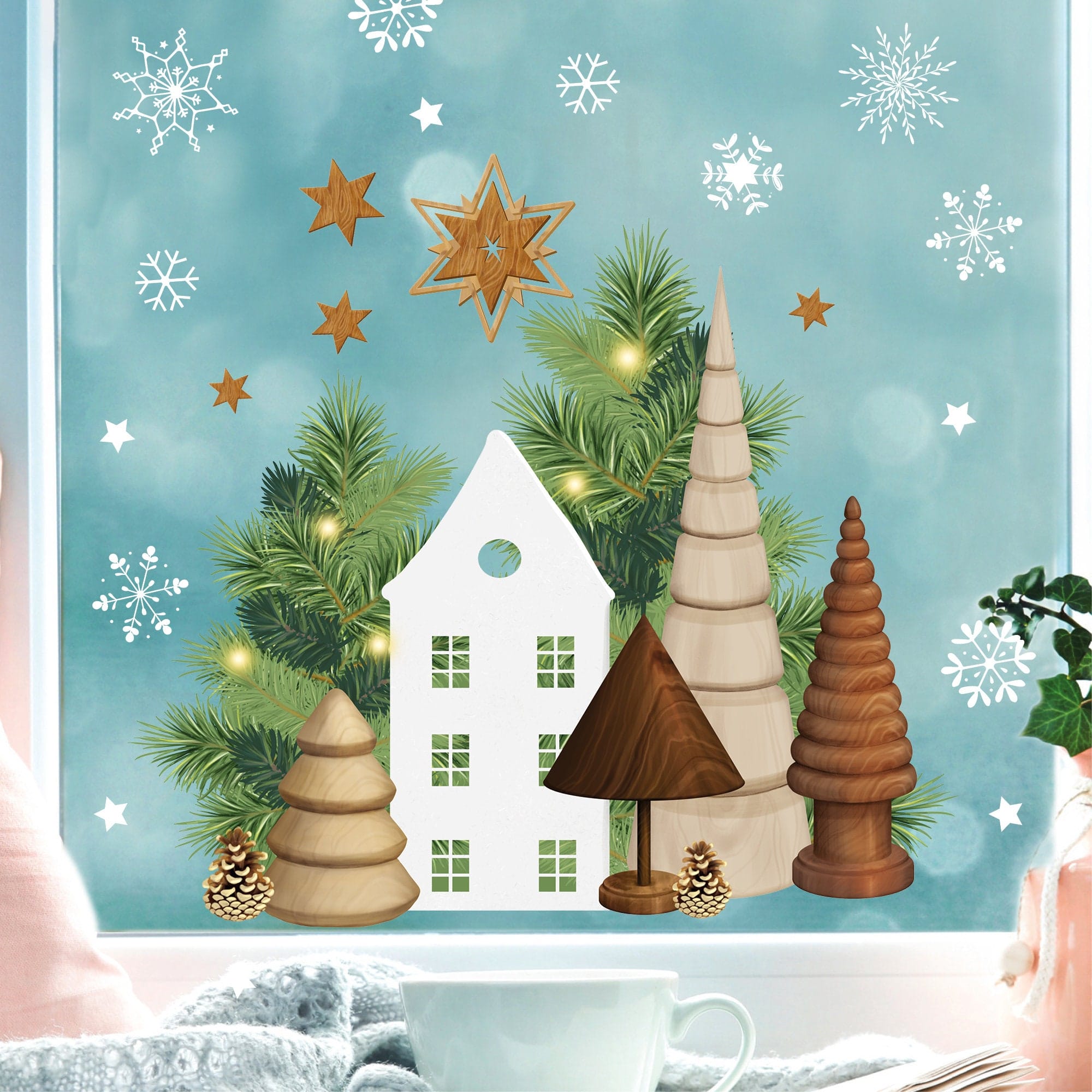 Wiederverwendbares Fensterbild Weihnachten Haus Tannenbäume Holzoptik Sterne Fensterdekoration Weihnachten Winter